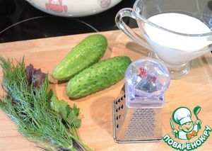 Для подачи с оладьями приготовить огуречный соус. Для этого потереть на мелкой терке свежий огурец, мелко нарубить зелень и смешать все это со сметаной или домашним йогуртом, посолить по вкусу. Поставить его в холодильник на 20-30 минут.