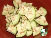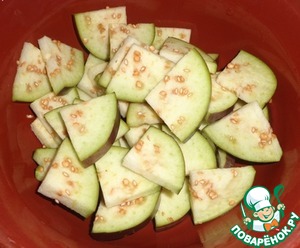 Баклажан помыть и порезать на средние кусочки. Посолить и оставить минут на 15.