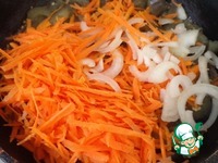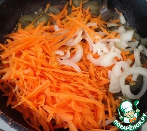 Добавляем натертую на крупной терке морковь и репчатый лук (полукольца).