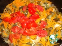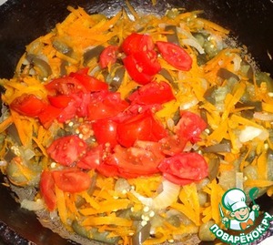 Помидор порезать на кубики и добавить в сковороду через 3-5 минут после моркови. Добавляем измельченный чеснок для вкуса.