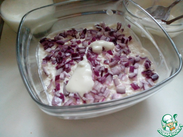 • Следующим слоем идёт мелко порубленный красный лук, и тоже промазывается майонезом.
