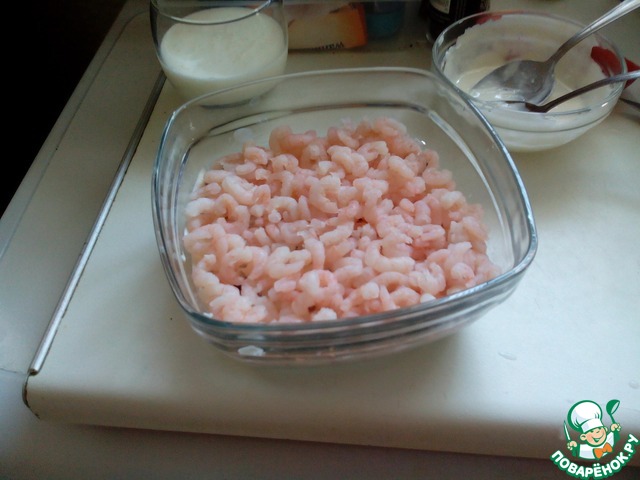 • Слой креветок- их можно добавить отваренными, посолить поперчить, а можно и немного обжарить, тогда вкус будет интенсивнее. Слой креветок тоже мажем майонезом.