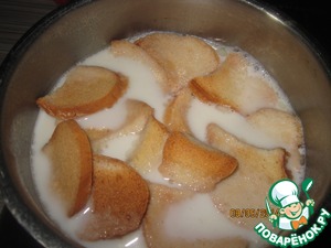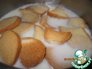 Корейку вытащить из бульона, положить в бульон сухарики. Залить молоком, предварительно доведенным до кипения. Накрыть крышкой и дать сухарям там хорошо набухнуть. Минут десять.