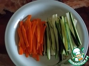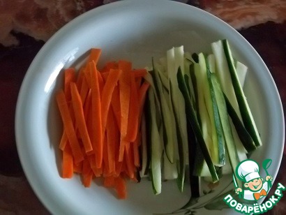 Морковь и цуккини нарезать соломкой 10-12 см. Морковь можно натереть на корейской терке. Я за неимением такой использовала овощечистку. А цуккини ножом, чтобы он не был слишком тонким.