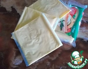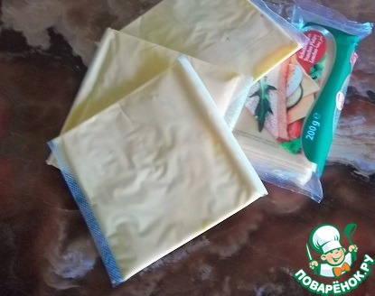Плавленый сыр я использую вот такой, предназначенный для сандвичей (у меня сыр с паприкой). Беру 3 пластинки по 15г.