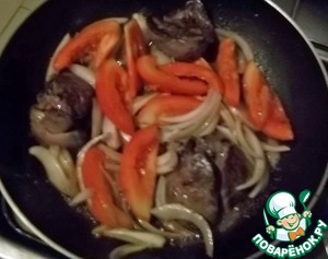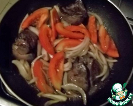 Куриную печень посолить и поперчить по вкусу. В горячей сковороде растопить немного масла и выложить куриную печень. (Если сковорода с антипригарным покрытием, то можно и без масла). Поджарить печень с одной стороны на среднем огне, перевернуть и сразу добавить лук и помидор.