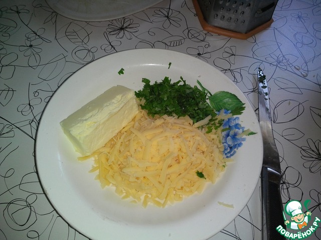 • Приготовить начинку: сыр натереть на терке, зелень порезать, добавить мягкое сливочное масло. Перемешать, сформировать шарики и убрать в морозилку