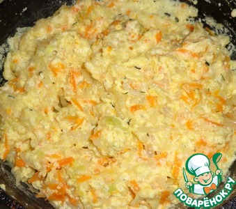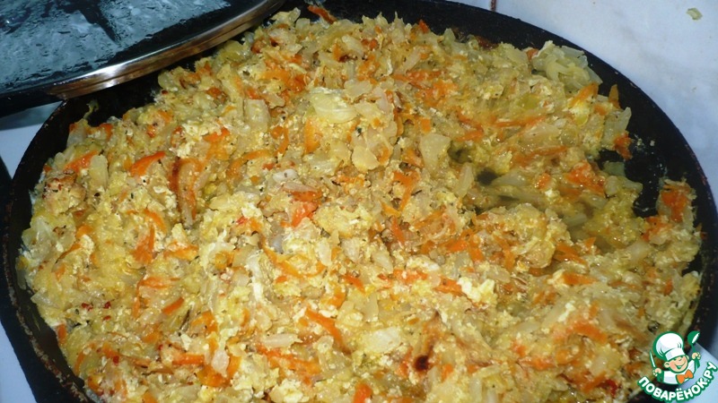 • Морковь натереть на крупной терке, лук нарезать полукольцами; выкладываем в сковороду. Посолить и поперчить по вкусу.