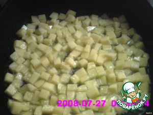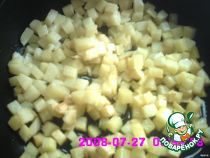 Картофель моем, чистим и нарезаем кубиками 1*1 см, слегка солим, обжариваем до золотистого цвета на среднем огне, небольшими порциями.