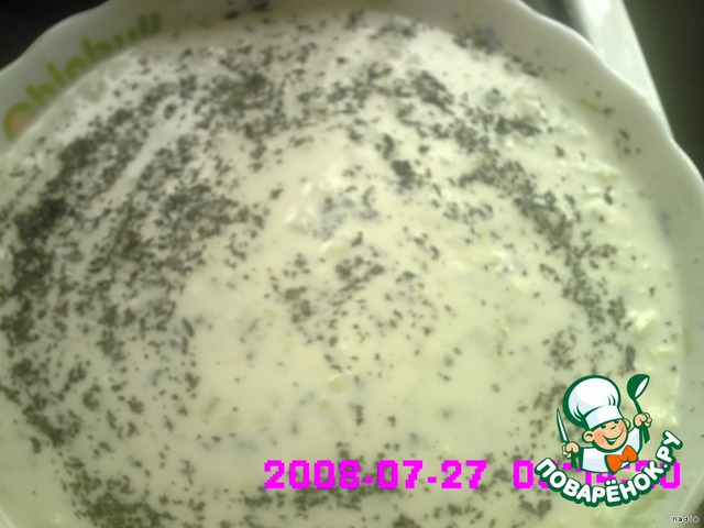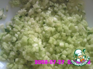 Итак, жумие – огурцы нарезаем как можно мельче, толчем чеснок. Все заливаем кефиром и посыпаем мятой.
