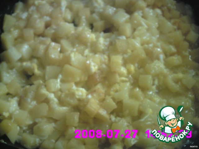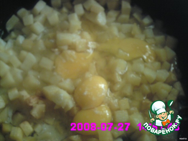 Если решили взять яйца, то их разбиваем в ту же посуду где жарили картофель еще подсаливаем яйца, добавляем мускат (рука так и тянет написать –бгар). Жарим до готовности яиц. Можно подать с салатом, но в нашей семье подают с жумие (что-то вроде окрошки). Также можно соленые огурцы, перец, баклажаны и т. п.