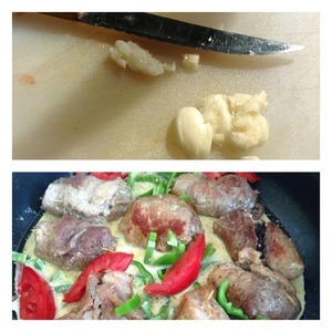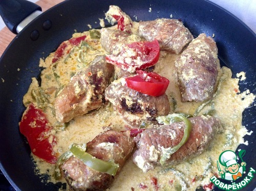 Очистить чеснок и раздавить его лезвием ножа, добавить к мясу. Влить сливки, добавить сливочный сыр, карри и аккуратно перемешать. Можно немного подсолить.