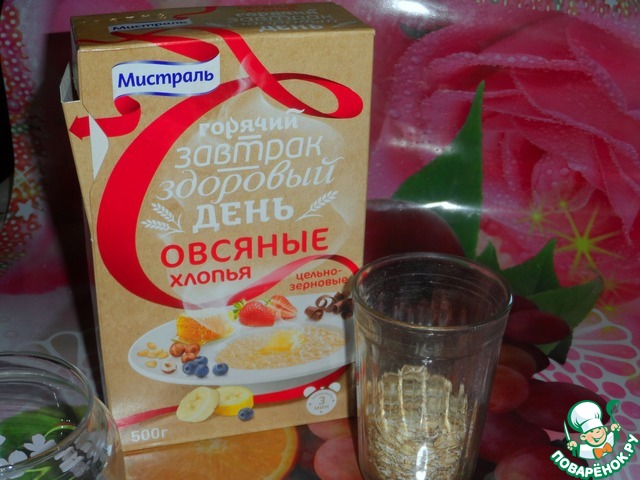 Нам нужно 1/2 стакана овсяных хлопьев. Я использую хлопья ТМ "Мистраль". Высыпаем хлопья в банку объемом 0,5 литра.