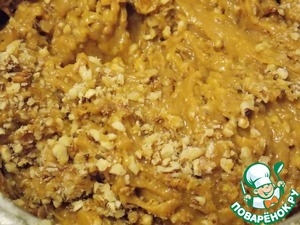 Муку смешать с разрыхлителем и просеять. Соединить с тестом и хорошо перемешать. Орехи измельчить не очень мелко и добавить в тесто. Все еще раз хорошенько перемешать.