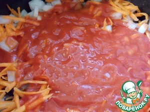 Томатную пасту развести водой, присолить, положить сахар, перемешать и вылить на морковь. Положить специи и перемешать.