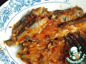 По мотивам консервов "Килька в томате". Когда-то все летние каникулы я проводила в деревне у бабушке. Это конечно парное молоко, свой хлеб, чистый воздух и речка. А еще это рыбалка и ночное с ребятами. Для тех кто не знает, ночное - это пастбище для лошадей в ночное время. И конечно на природе очень хотелось кушать нашим растущим организмам. Кто что брал с собой туда, а мы с сестрой приносили консервы. Это были " Минтай в масле" (сейчас их нет вообще) и "Килька в томате". Молодые скажут -Да ну, нашли чего. Это значит только то, что они не пробовали ТУ настоящую. А попадалась им лишь пародия на эти консервы. Ну или мне просто сейчас с ними не везет. Попадается все какое то не понятное месиво. Хочу предложить Вам рецепт, рыбка по которому получается очень похожей на ту настоящую.