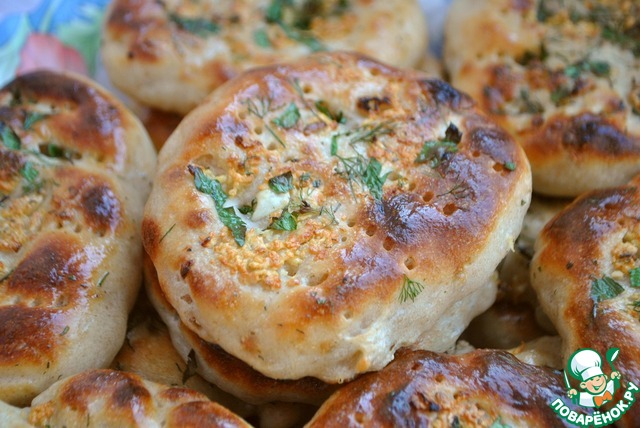 Чесноком и посыпать зеленью, чуть утапливая и чеснок и зелень в тесте.