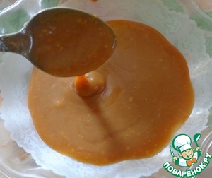 Для начала приготовим карамельный соус: в кастрюлю высыпаем сахар (4 ст. л.) и варить до коричневого цвета, затем добавляем сливочное масло, мешаем до полного его растворения. выключаем газ и добавляем сметану, если образовались комочки до разбить их можно с помощью миксера. Дать остыть соусу, чтобы загустел.