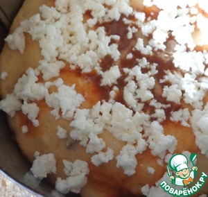Как только тесто схватится. Достаем из духовки и посыпаем творогом и смесью из сахара и корицы. И ставим обратно в духовку, выпекаем до сухой спички.