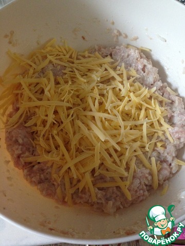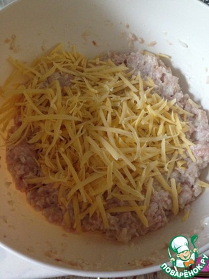 Смешиваем все ингридиенты фарш, яйцо, добавляем из измельчителя смесьлука чеснока и батона, трем на крупной терке сыр, солим, перчим.