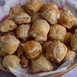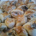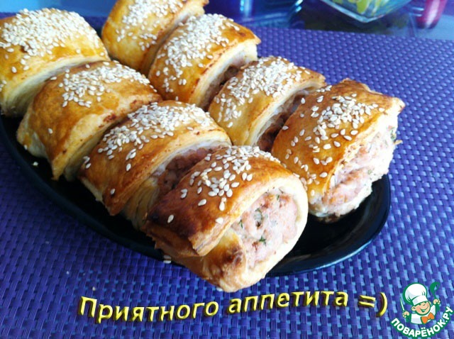 4. Выложить на противень, смазать желтком, посыпать кунжутными семенами и запекать 15 мнут до золотистого цвета. Можно подавать со сладким соусом чили и украсить листьями кинзы.