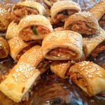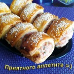 Фуршетные рулеты, маленькие, на один зубок, ароматные, с экзотической ноткой, и очень вкусные. Прекрасно подходят в качестве закуски к вину.