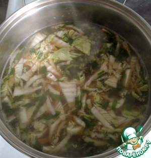 Бульон закипятить, ввести приправу, чеснок, перец, соевый соус, имбирь, соль.