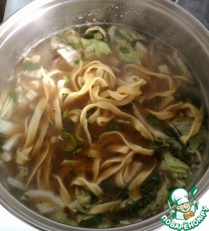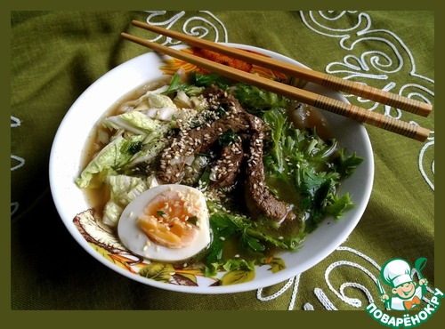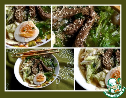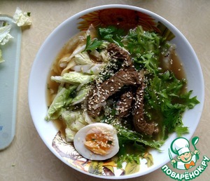 Сытное горячее блюдо с восточными нотками. Согревает тело и душу. Удобно тем, что используются составляющие приготовленные заранее. Бульон можно сварить, заморозить. Любое тушеное или вареное мясо. Лапшу не только домашнюю.