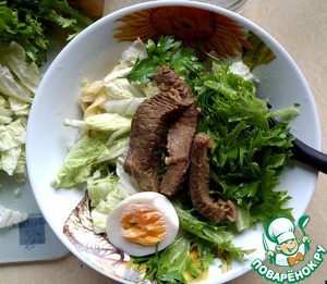 Добавить в тарелку тонкие части капусты, салат, мясо, половинку яйца