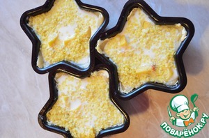 Далее добавить в формы пшенные хлопья, не требующие варки, от ТМ "Мистраль" - по 2 столовых ложки с горкой