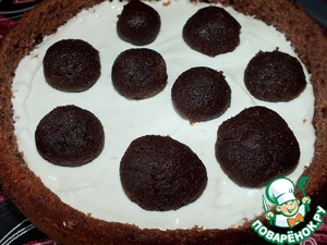 Заливаем нашу бисквитную форму слоем творожной начинки, затем выкладываем шоколадные шарики, сверху накрываем оставшейся творожной массой. Украшаем сверху оставшимися "трюфельками". Убираем в холодильник на час.