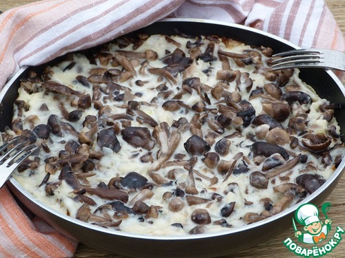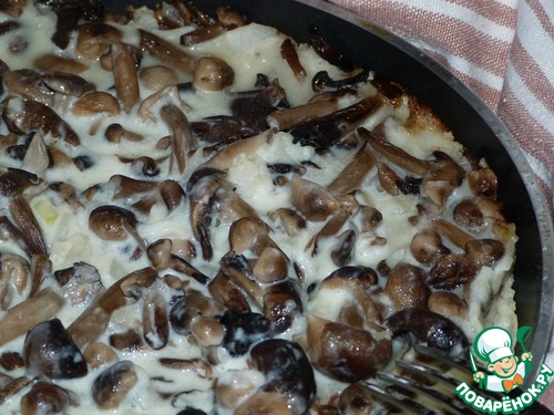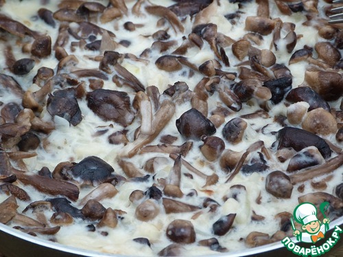 Как грибы с луком будут готовы, не выключая огонь, аккуратно их залить молочно-мучной смесью. Перемешивать не надо. Убавить огонь до минимума, накрыть сковороду крышкой и оставить так минут на 10.