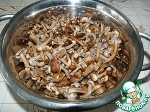 Потом, не знаю правильно или нет, но мы делаем так: грибы замачиваем в холодной воде на несколько часов (можно даже на ночь). Затем, воду слить через дуршлаг, грибы промыть и сложить в кастрюлю. Залить опята водой и поставить на огонь. После закипания отваривать минут 5-7. Отваренные грибы откинуть на дуршлаг и промыть холодной водой. Оставить опята в дуршлаге на некоторое время, чтобы стекла вода. -