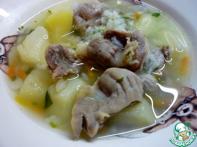 Бульон я варила на косточках от курицы заранее с вечера. Очень наваристый получился бульон. Готовим потрошка, (желудки предворительно замочить в холодной воде на 3-4 часа), промываем их хорошенько и нарезаем на более мелкие кусочки.