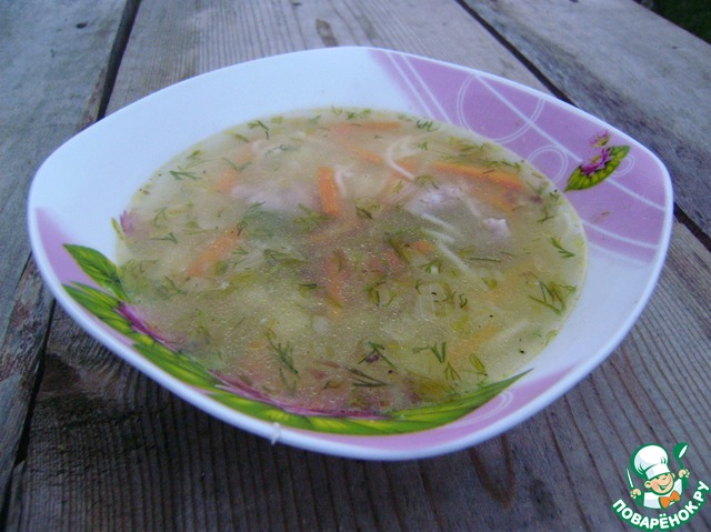 За 5 минут до конца варки кладем вермишель. Можно использовать домашнюю лапшу, я положила магазинную паутинку.