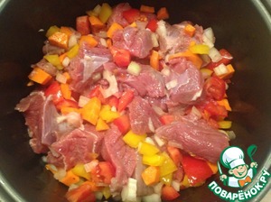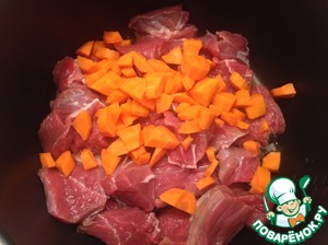 Выложить мясо в чашу мультиварки, добавить порезанную кусочками морковь.