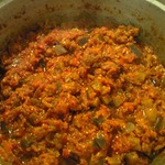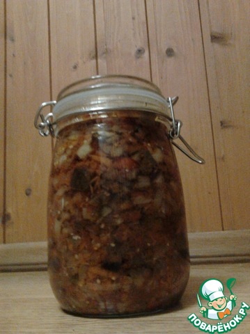 Как все пережарилось заливаем молотыми помидорами. Сыпем соль и сахар. Как закипит варим 40 мин. Разливаем по банкам и стерилизуем