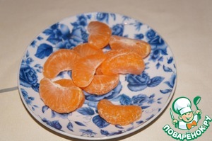 С одного мандарина стереть цедру и выдавить сок. Два оставшихся тщательно очистить от кожуры и белых прожилок и аккуратно разделить на дольки.