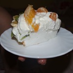 Основа для торта готова, пора сделать крем. Холодные сливки взбиваем, постепенно добавляя в них сахарную пудру и ванилин, до пиков. Сливочный крем, похожий на настоящий, только растаявший пломбир, готов. Заполняем им середину заготовки из безе. Сверху украшаем фруктами.