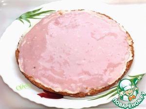Смазываем сметано ягодной смесью нижний корж. Даем немного застыть