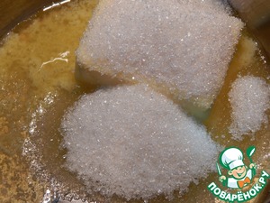 В кастрюле растапливаем сливочное масло и 1/4 стакана сахара. Перемешиваем до однородной массы.