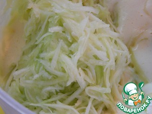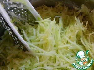 Тем временем, очищаем и натираем кабачок на крупной терке. У нас получается 2 с небольшим стакана натертого и отжатого кабачка.