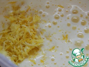 Взбиваем 2 целых яйца, белок третьего яйца и сахар. Добавляем лимонный сок и цедру.