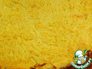 Достаем корж из духовки, выливаем на него (на горячий) кабачковую массу и отправляем опять в духовку на 20-25 минут, пока масса не загустеет (станет золотистой).
