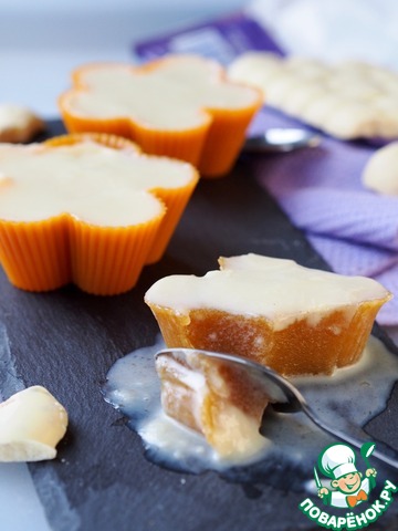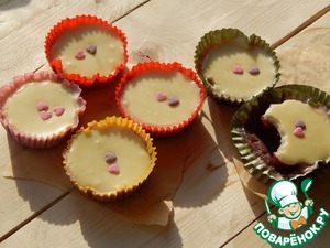 Разливаем в бумажные формы. Для того, чтобы формы не расползались, вкладываем их в форму для кексов. Даем остыть и убираем в холодильник для застывания минимум часа на 2. Затем заливаем сверху растопленным белым шоколадом, даем шоколаду застыть.