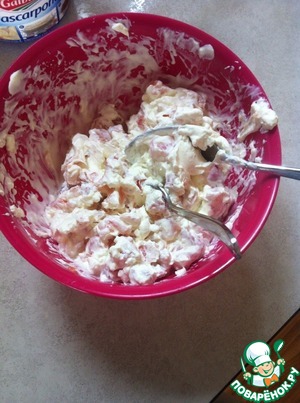 Итак! Семгу порезать на кубики где-то 0,5 мм и выложить в миску с маскропоне -
