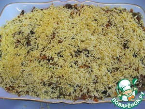 4-й слой - грибы с луком и морковью, сверху посыпать натертым на мелкой терке желтком.