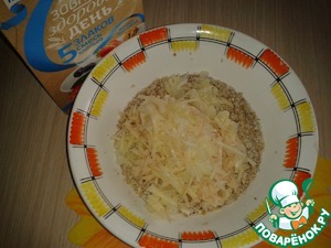 Пока хлопья набухают, чистим картошину и луковицу. Натираем на тёрке. Добавляем к хлопьям. Солим, перчим, тщательно перемешиваем.