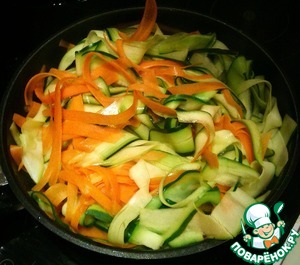 Специальным ножом срезать тонкие полоски цуккини и морковки, выложить на сковороду и тушить в масле примерно 5 минут на медленном огне.