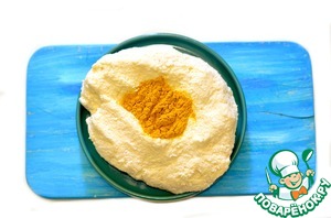 Готовое тесто для вареников разделить на 3 части. В первую часть добавить куркуму и по желанию можно сок моркови.